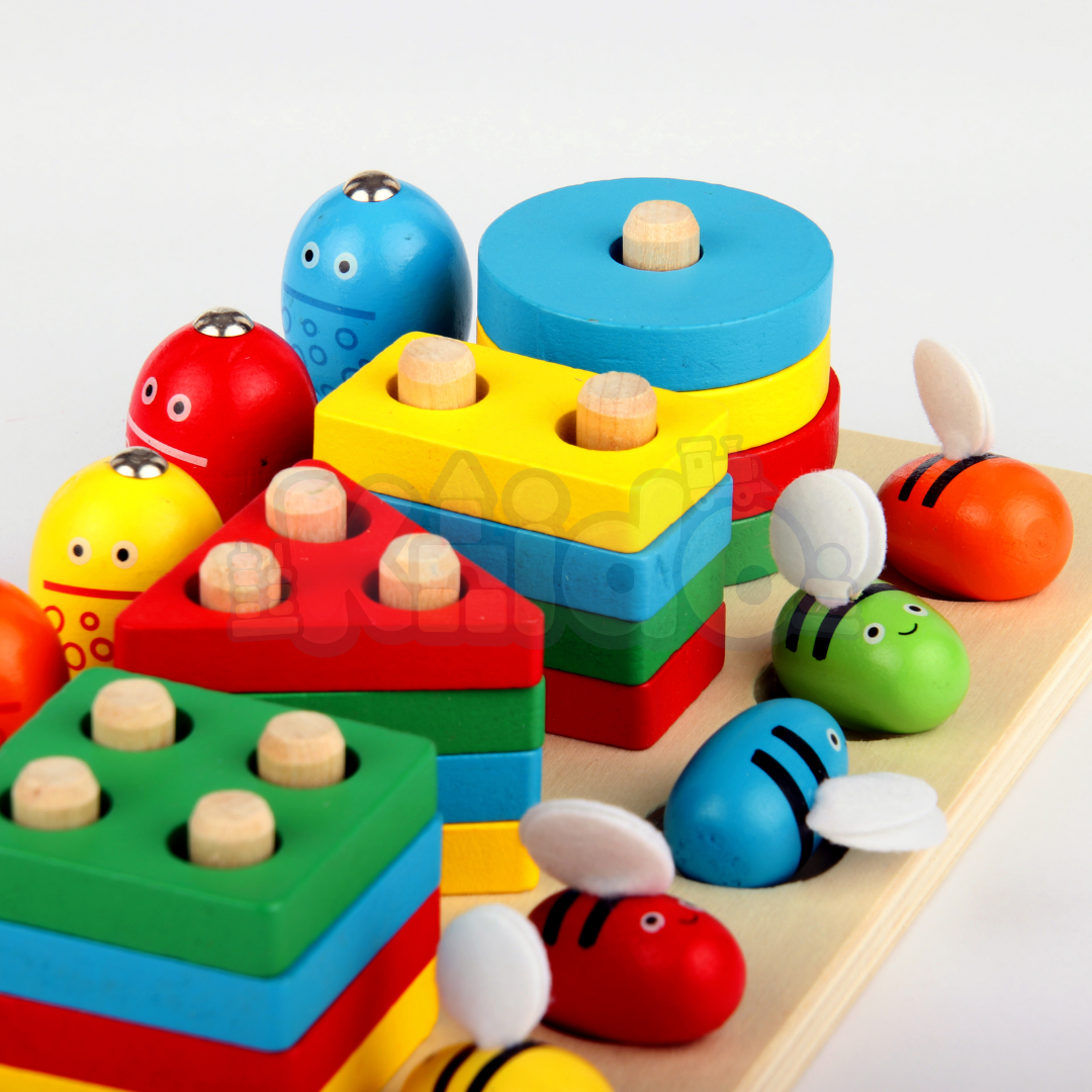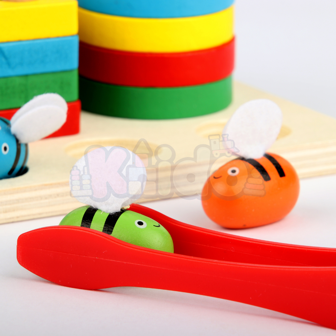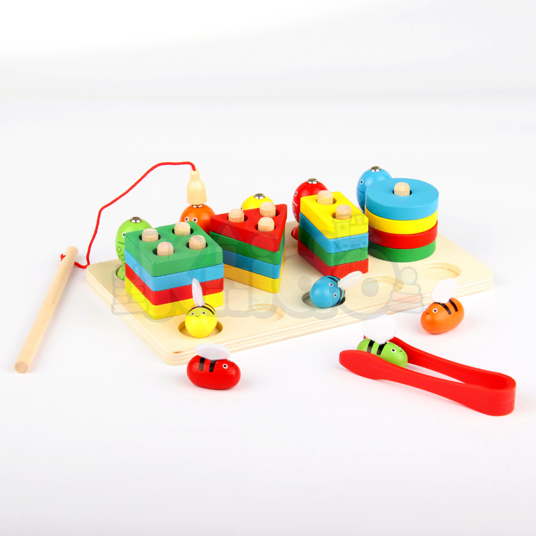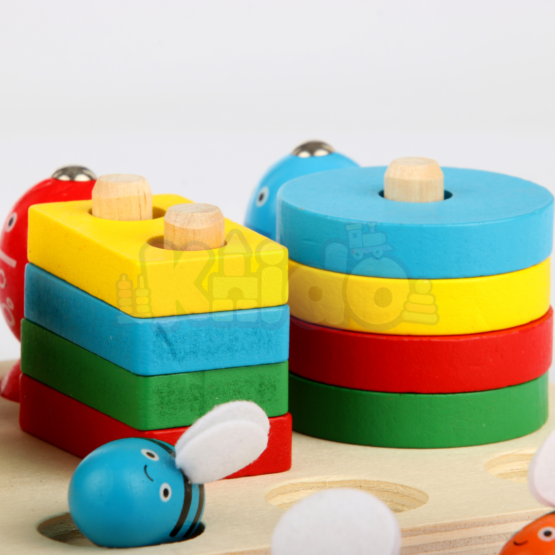 Cet incroyable jouet offre une expérience triplement stimulante, engageant les petits esprits dans une aventure éducative passionnante. La base en bois, les piliers pour empiler des formes géométriques, et les poissons à chasser à l'aide d'une canne à pêche offrent déjà une diversité d'activités. Mais ce n'est pas tout ! Un troisième niveau de jeu ajoute une touche supplémentaire avec une pince en plastique, permettant aux enfants de chasser et de placer délicatement des abeilles.
