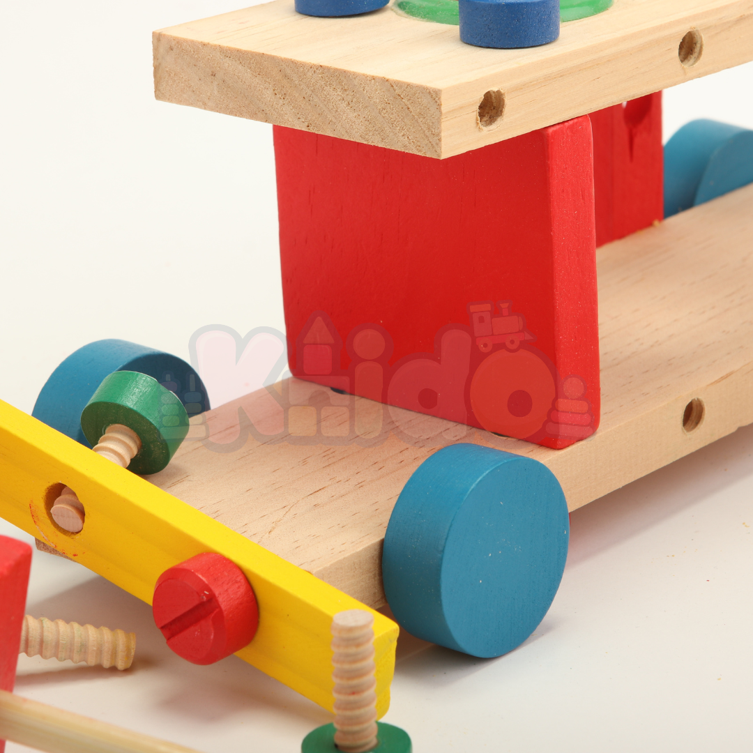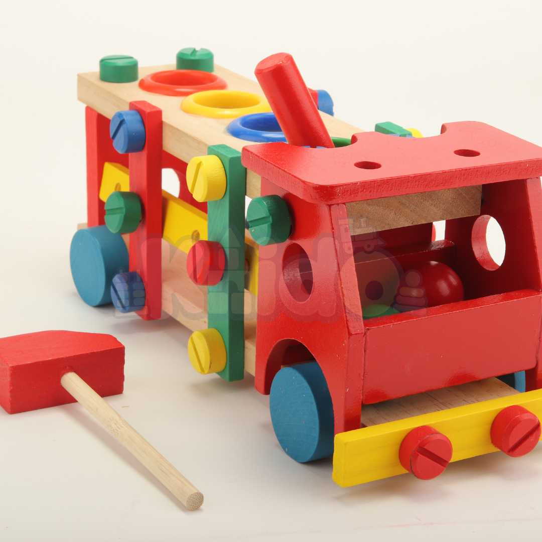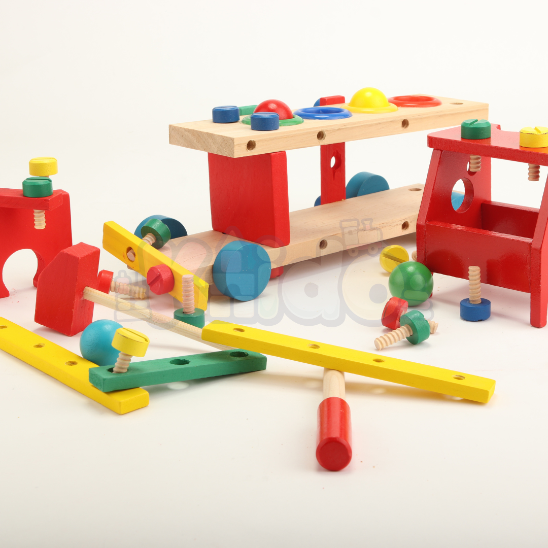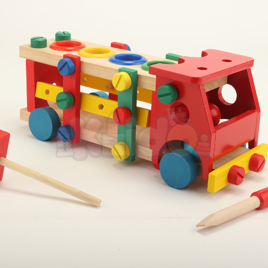 Pour y jouer, l'enfant doit assembler toutes les pièces à l'aide d'un marteau et d'un tournevis afin de créer un camion avec des roues prêtes à rouler.
