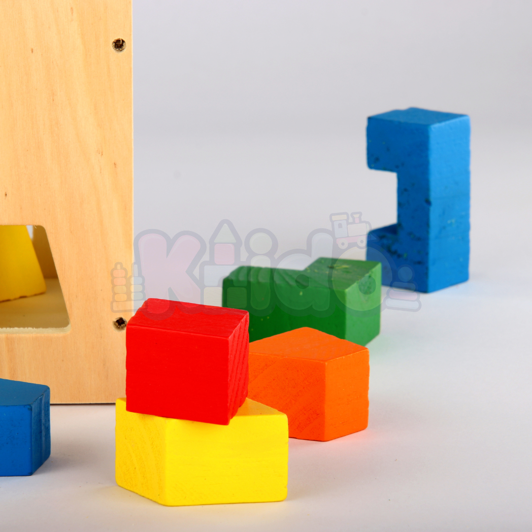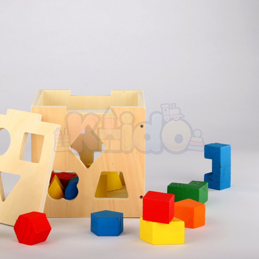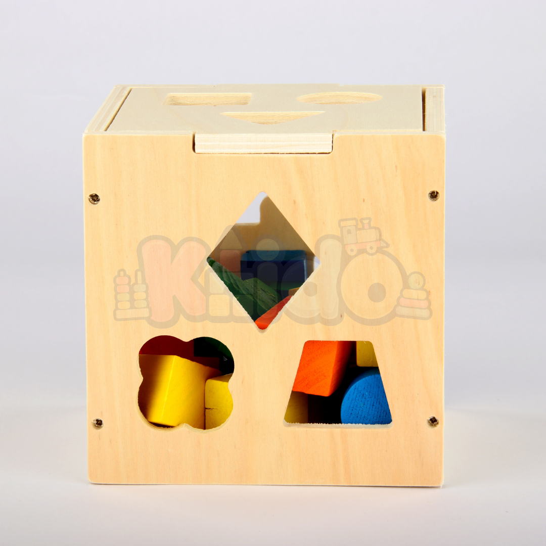 Les enfants sont encouragés à explorer et à insérer chaque forme à l'intérieur du cube par la bonne ouverture, renforçant ainsi leur coordination main-œil.
