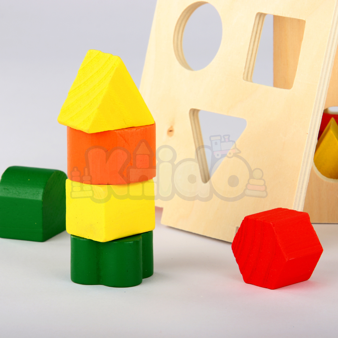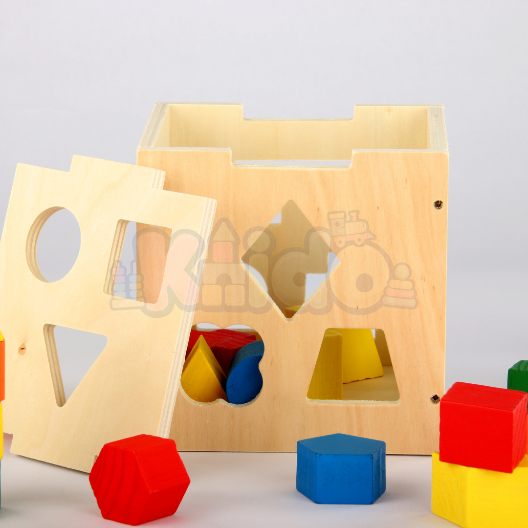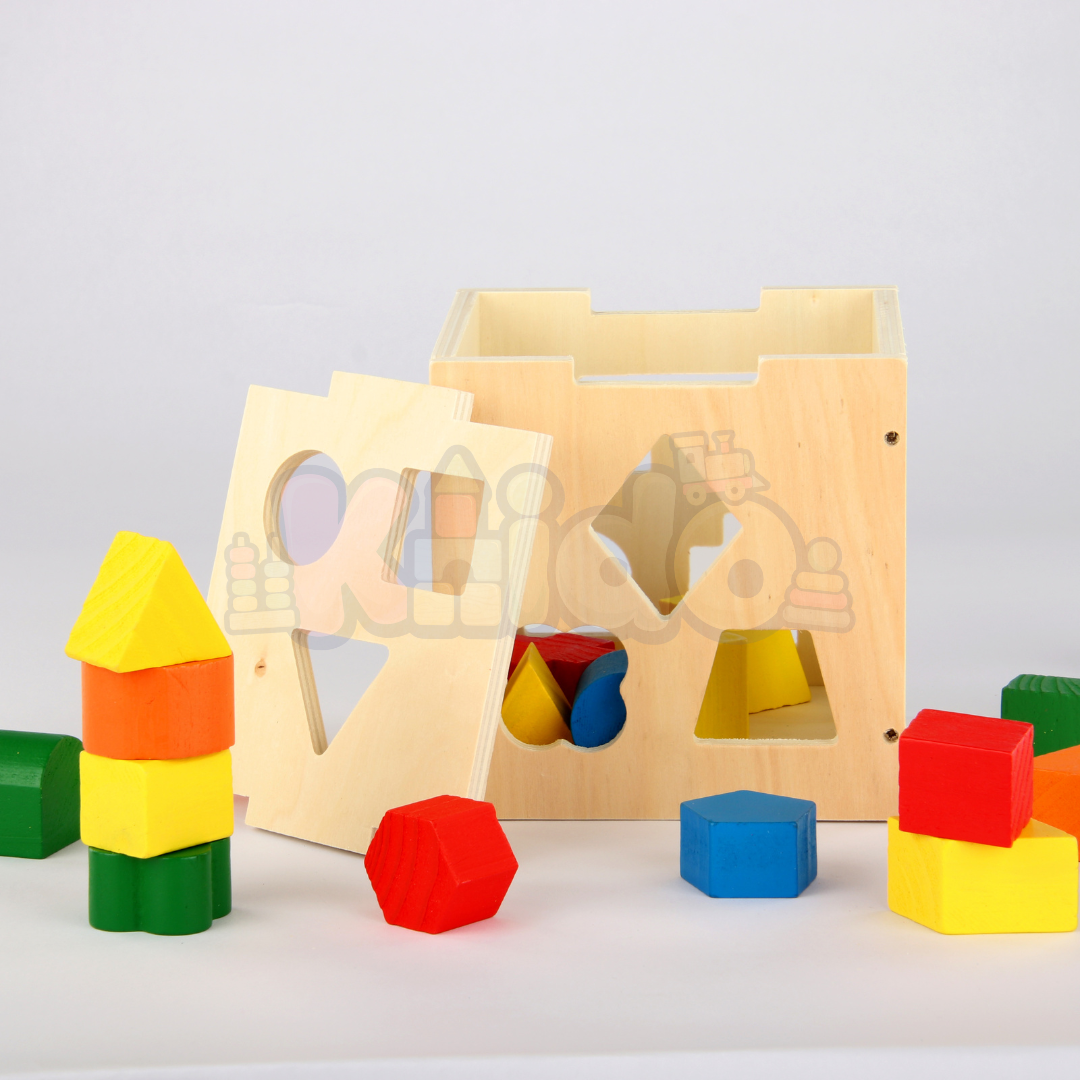 Les enfants sont encouragés à explorer et à insérer chaque forme à l'intérieur du cube par la bonne ouverture, renforçant ainsi leur coordination main-œil.