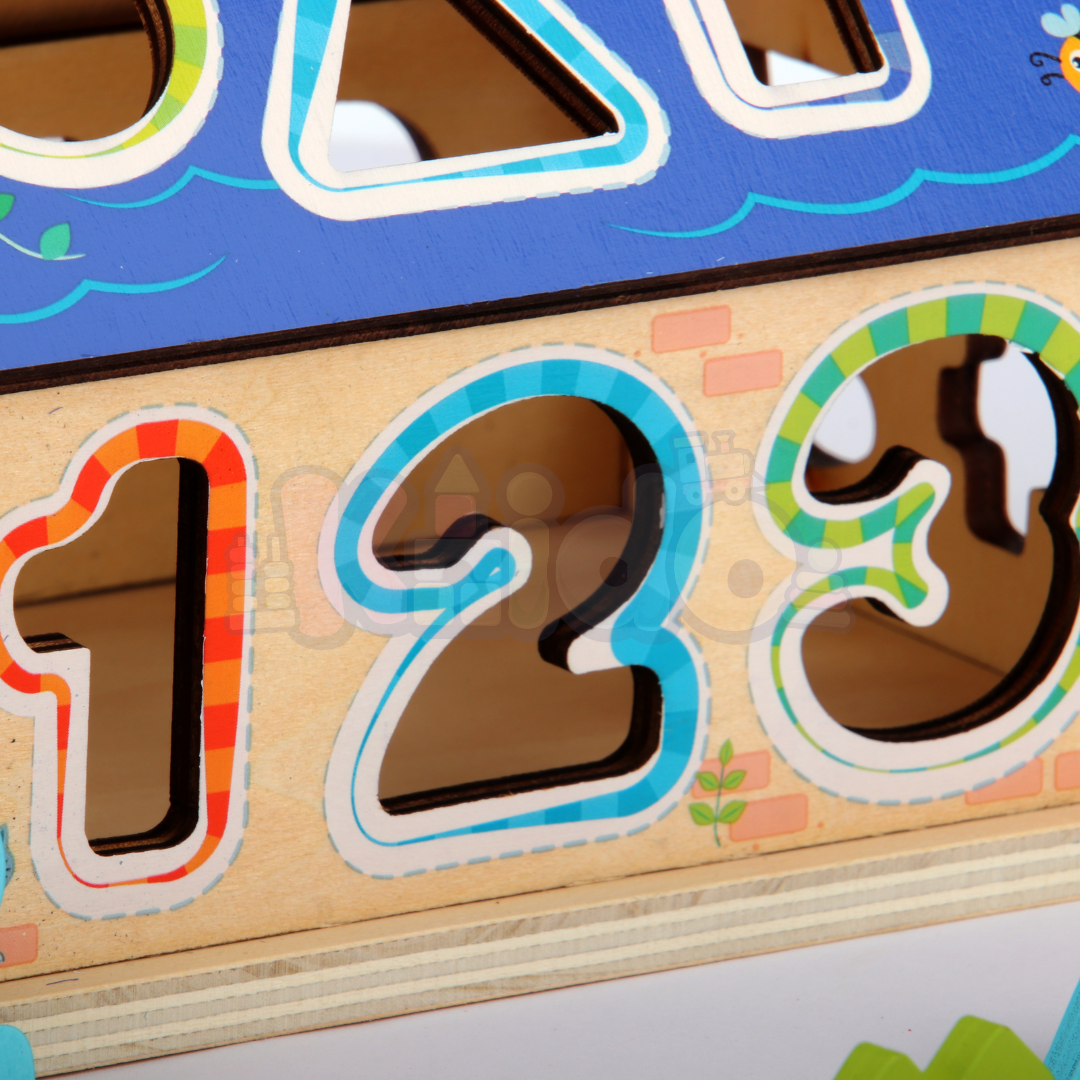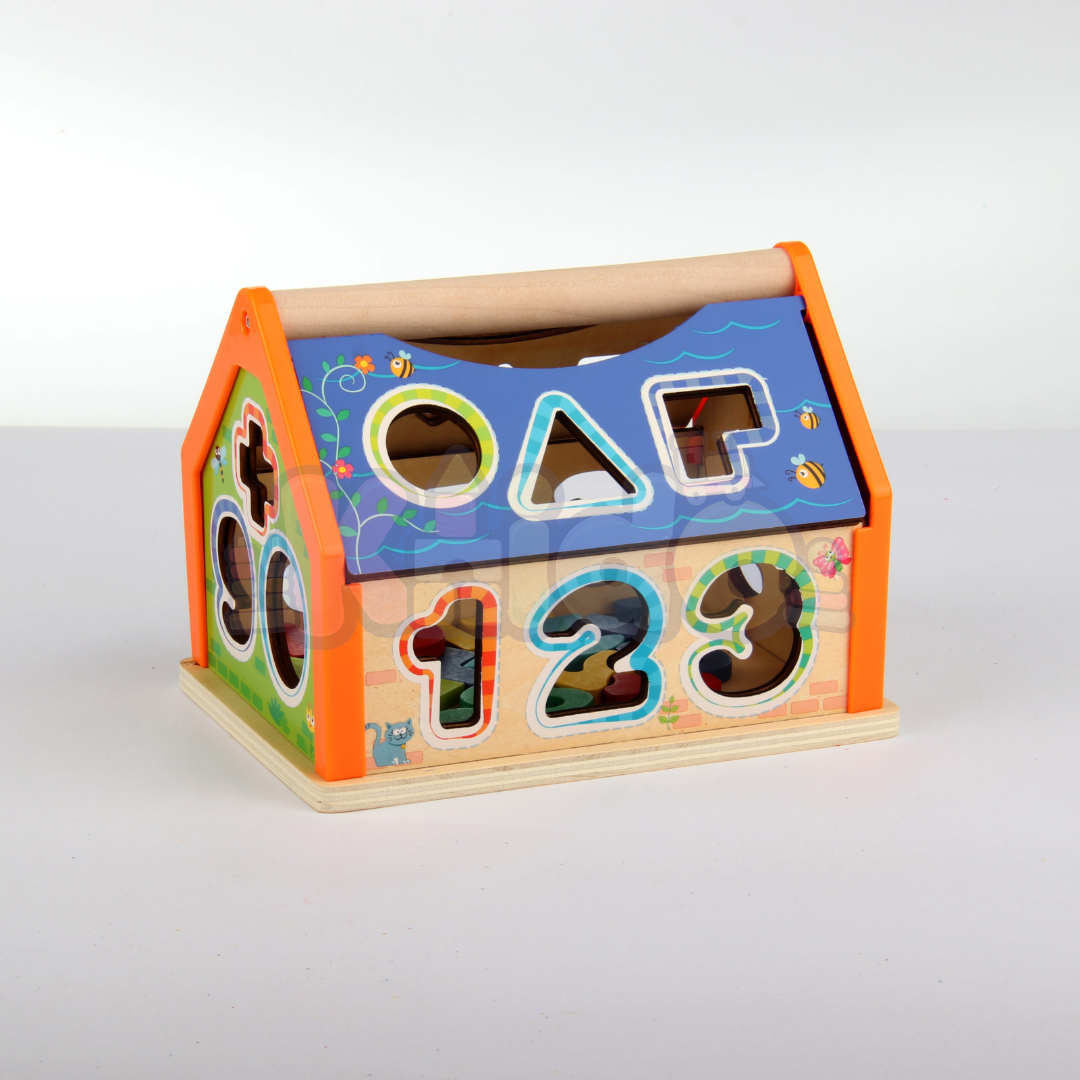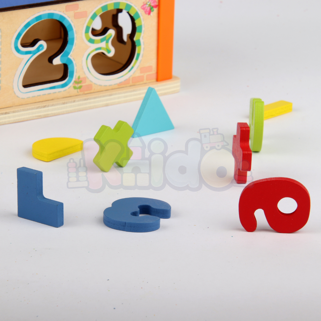 Entièrement fabriqué à partir de bois massif et de peinture à l'eau, ce jouet captivant est composé d'une maison et de plusieurs formes géométriques et chiffres aux couleurs vibrantes.