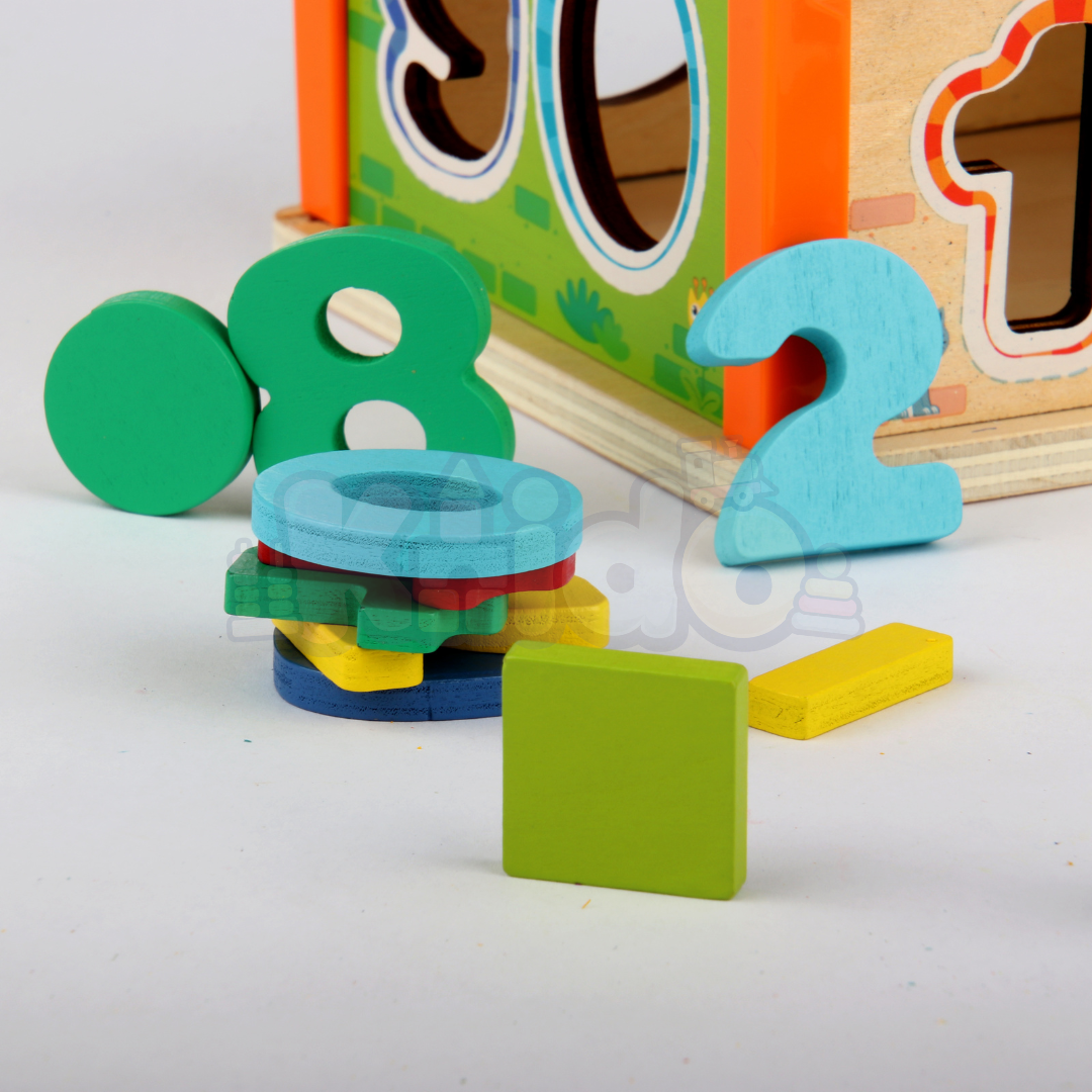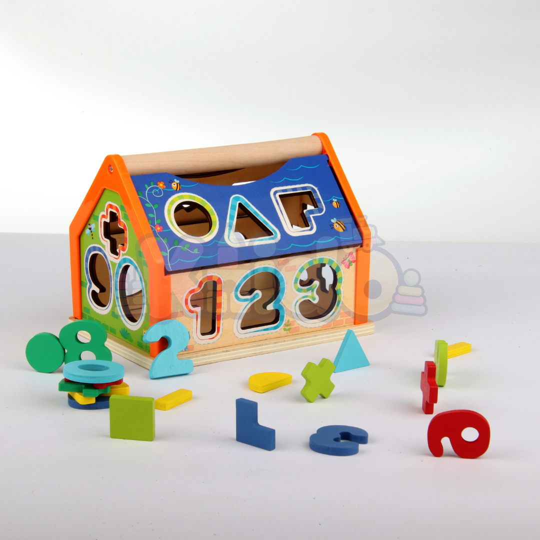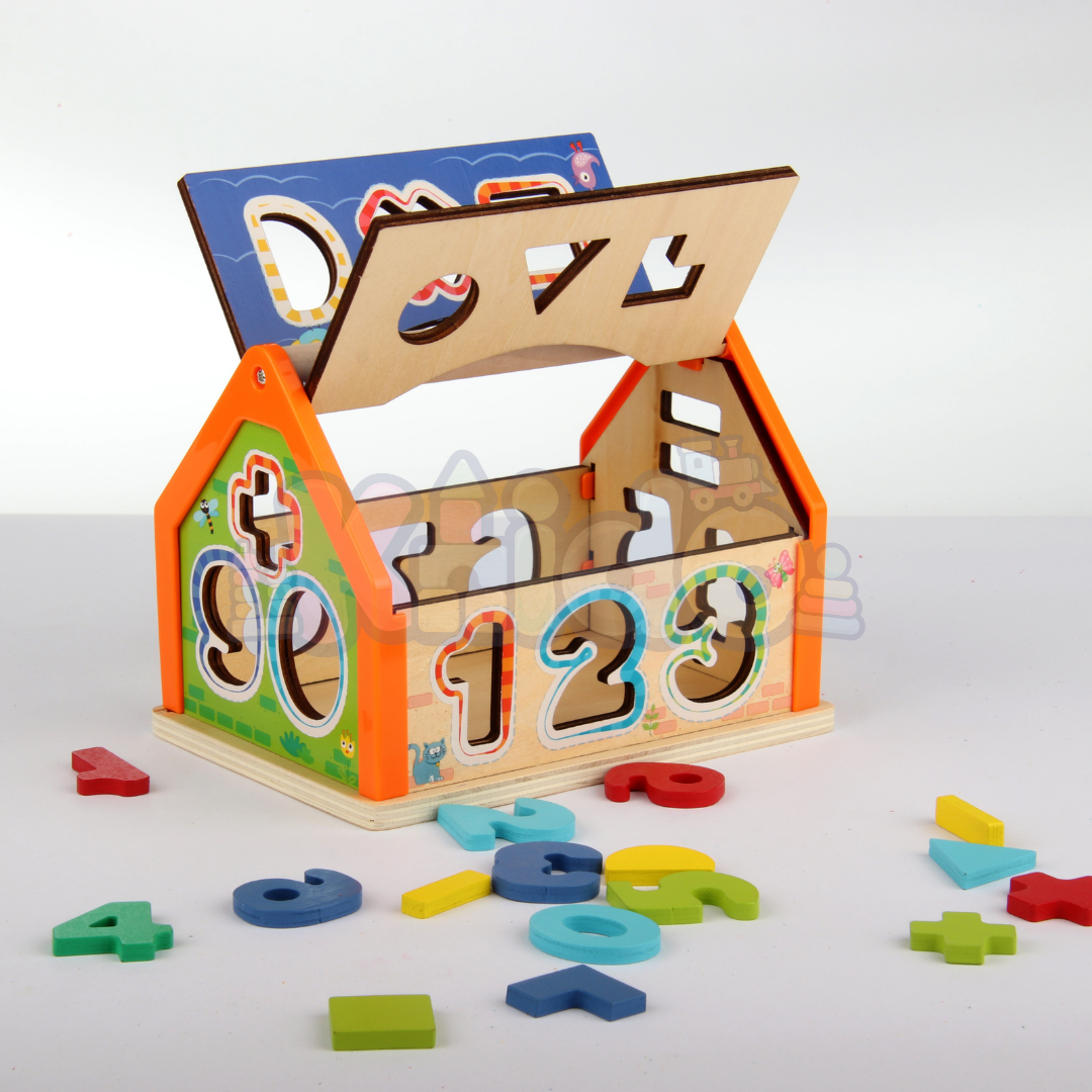 Entièrement fabriqué à partir de bois massif et de peinture à l'eau, ce jouet captivant est composé d'une maison et de plusieurs formes géométriques et chiffres aux couleurs vibrantes.