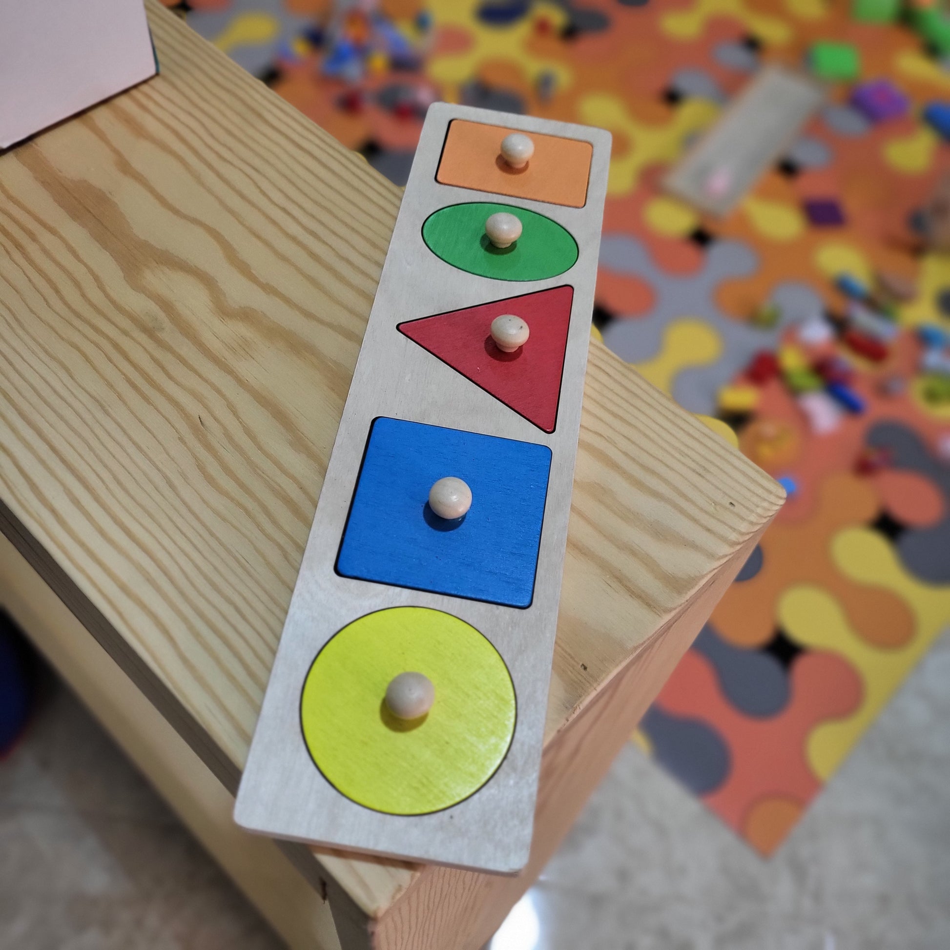 Proposant 5 formes geometriques differentes, conçues en bois, permettant d’apprendre les formes et les couleurs.